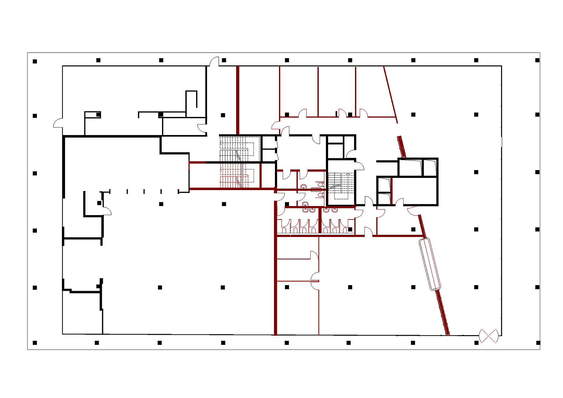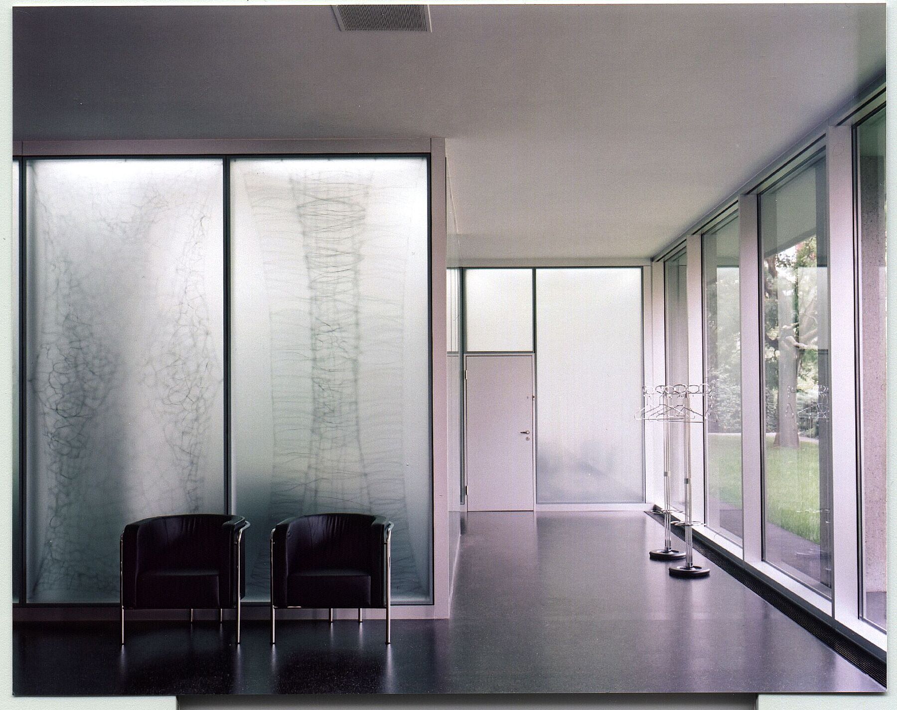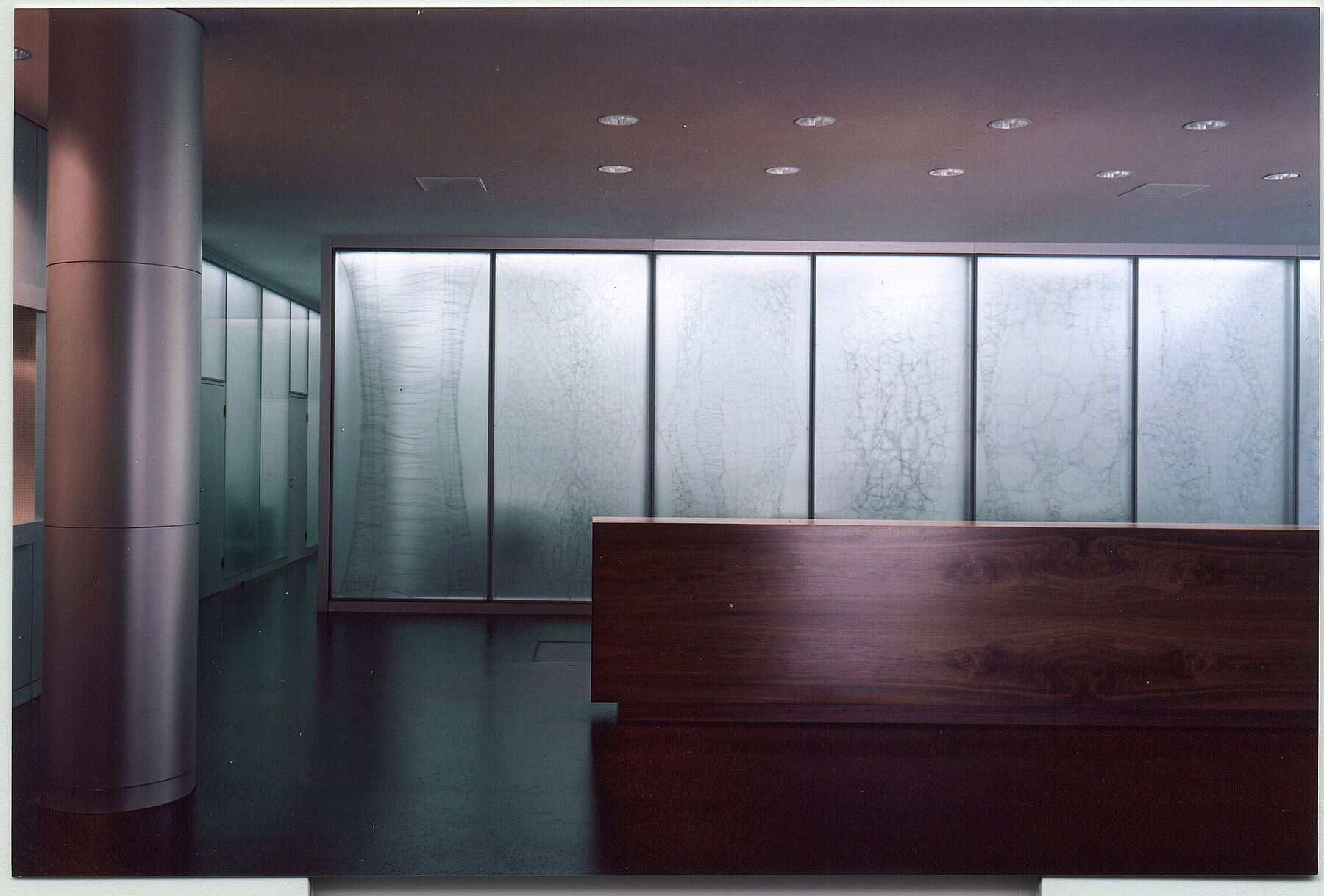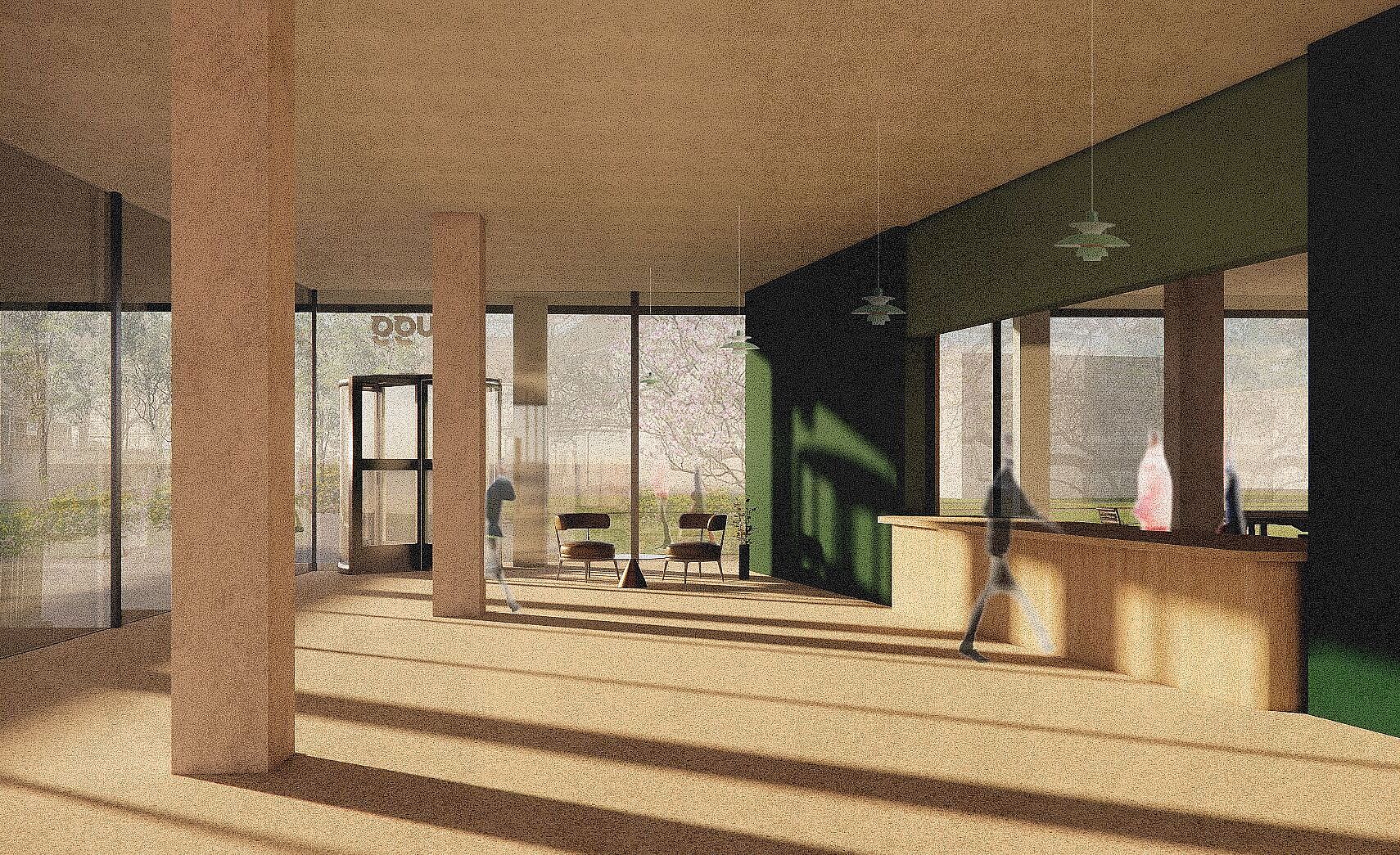 Im Erdgeschoss trennt eine geneigte Wand die unterschiedlichen Bereiche voneinander. Sie wirkt als leichtes, orientierendes Element und nimmt in Materialität und Farbigkeit Bezug auf die grünen Glaselemente der bestehenden Fassade.
