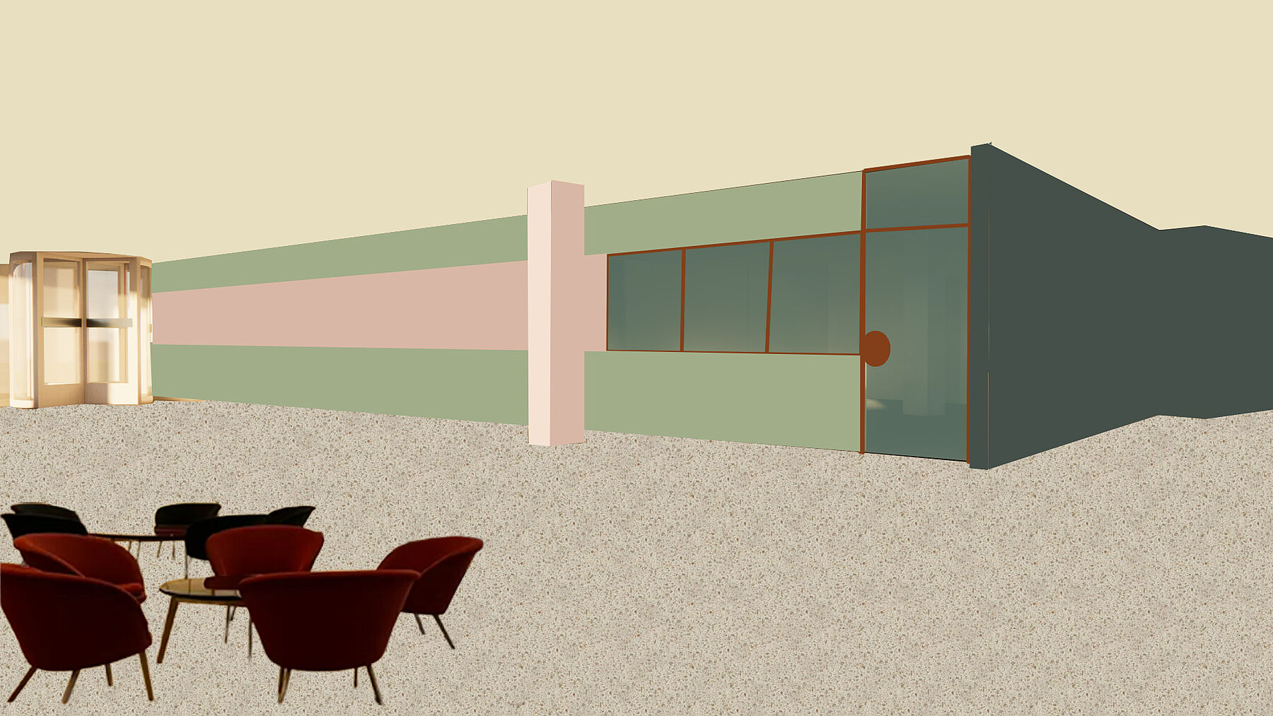 Das Material- und Farbkonzept knüpft bewusst an den Bestand an: Der fugenlose Terrazzo-Boden im Innenraum greift die Materialität des aussenliegenden Sichtbetons auf und verweist so auf die konstruktive Logik sowie die Entstehungszeit des Gebäudes. Er bildet eine robuste, zeitlose Grundlage für die neuen Nutzungen.