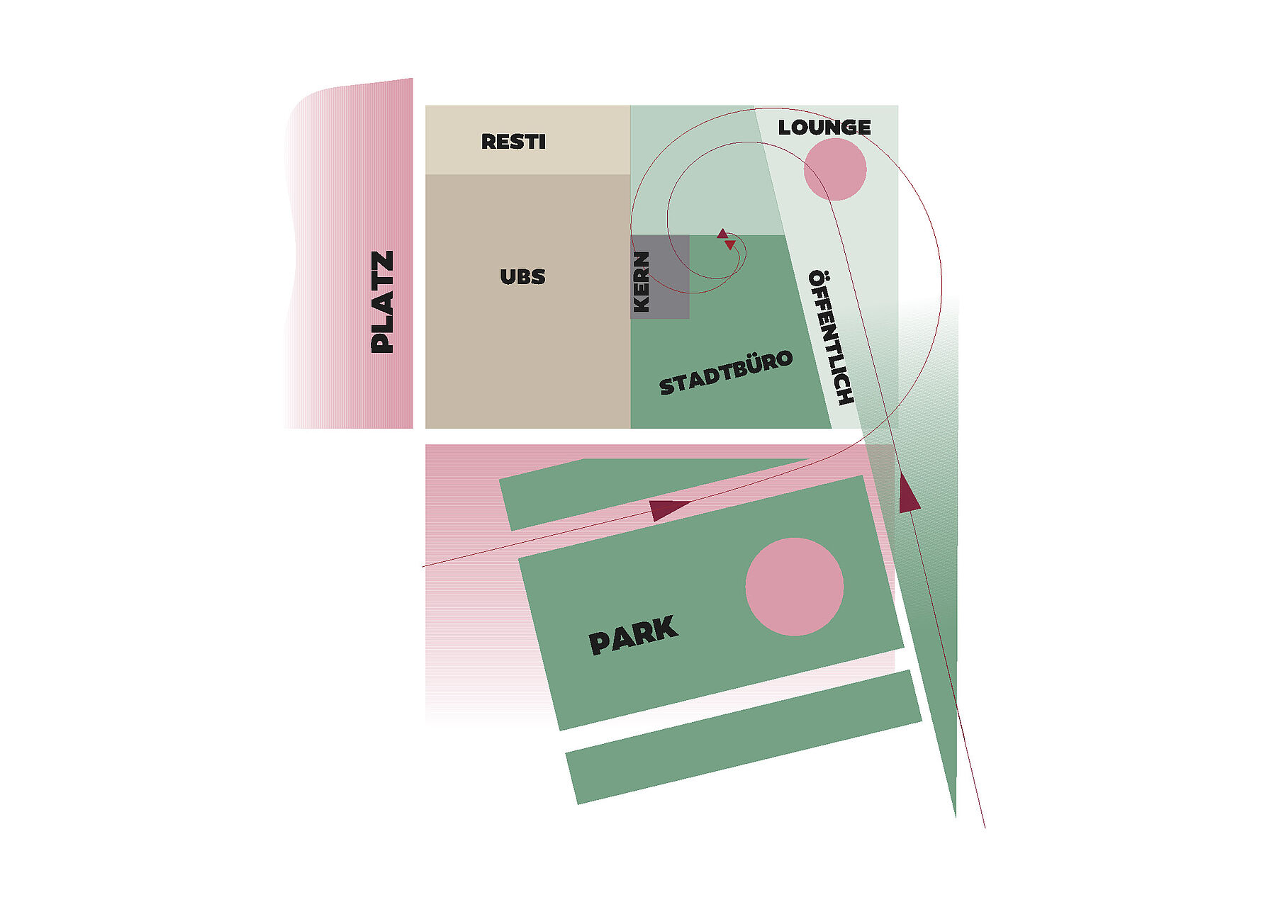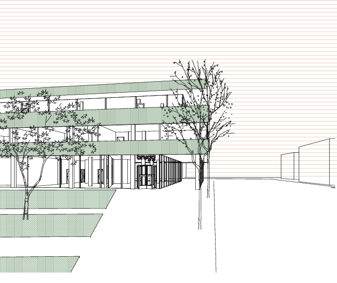 Das Projekt Magnolienblüte verortet den neuen Verwaltungssitz der Stadt Brugg im von Roland Rohn erstellten und von Burkard Meyer erweiterten Bankgebäude und nutzt den angrenzenden Park als konzeptionellen Ausgangspunkt. Die leichte Schrägstellung des Parks zum Gebäude erzeugt eine klare Bewegungsrichtung, die im Projekt bewusst aufgenommen und weitergeführt wird. Während sich der heutige Schwerpunkt des Lebens an der Ostseite entlang der Strasse befindet, schlägt das Projekt eine Neuorientierung der Adresse vor. Der neue Haupteingang der Stadt Brugg wird an der Nordwest-Ecke des Gebäudes positioniert, in direkter Verlängerung der Parkbewegung. Eine grosszügige, verglaste Lobby sich zum Grünraum und versteht sich als Übergang zwischen Aussen und Innenraum
