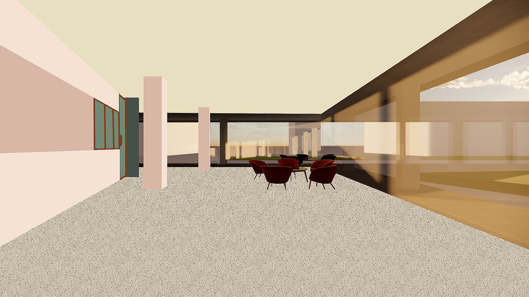 Die Stützen sind in einem warmen Rosaton gehalten, der subtil an die Farbe der Magnolienblüten erinnert. So verbinden sich Architektur, Material und Farbe zu einer ruhigen, stimmigen und identitätsstiftenden Gesamtatmosphäre.