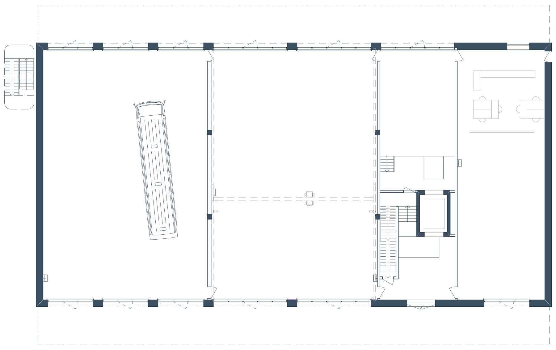 Der Neubau folgt einer klaren, funktionsorientierten Struktur, die auf effiziente betriebliche Abläufe und hohe Flexibilität ausgelegt ist. Im Erdgeschoss sind zwei Werkstätten und ein Ersatzteillager entlang einer zentralen Erschliessungs- und Lieferachse angeordnet, die als Hauptzufahrt für Waren dient. Ein darüber liegendes Zwischengeschoss nutzt die Raumhöhe optimal und integriert die Garderoben der Mitarbeitenden direkt an die Werkstattbereiche.Das erste Obergeschoss beherbergt weitere Lagerräume sowie entlang der zentralen Erschliessungsachse die Aufenthaltsräume der Mitarbeitenden, wodurch eine klare Trennung zwischen produktiven und pausenbezogenen Nutzungen entsteht. Das zweite Obergeschoss ist vollständig dem Lagerbetrieb vorbehalten. Alle Obergeschosse sind für flexible Lagernutzung mit 4,50 m Raumhöhe und 1.000 kg/m² Bodenbelastung konzipiert, direkt an den zentralen Warenlift angebunden und bei Bedarf in Einheiten teilbar oder für Büros, Garderoben oder Pausenräume umnutzbar. Fensteröffnungen können später wirtschaftlich nachgerüstet werden.Die beiden Untergeschosse bleiben als bestehende Betonstruktur erhalten, werden weiterhin als Selfstorage- und Möbellager genutzt und sind ebenfalls an den Warenlift angebunden. Für den Neubau werden die oberirdischen Bestandsstrukturen vollständig zurückgebaut.