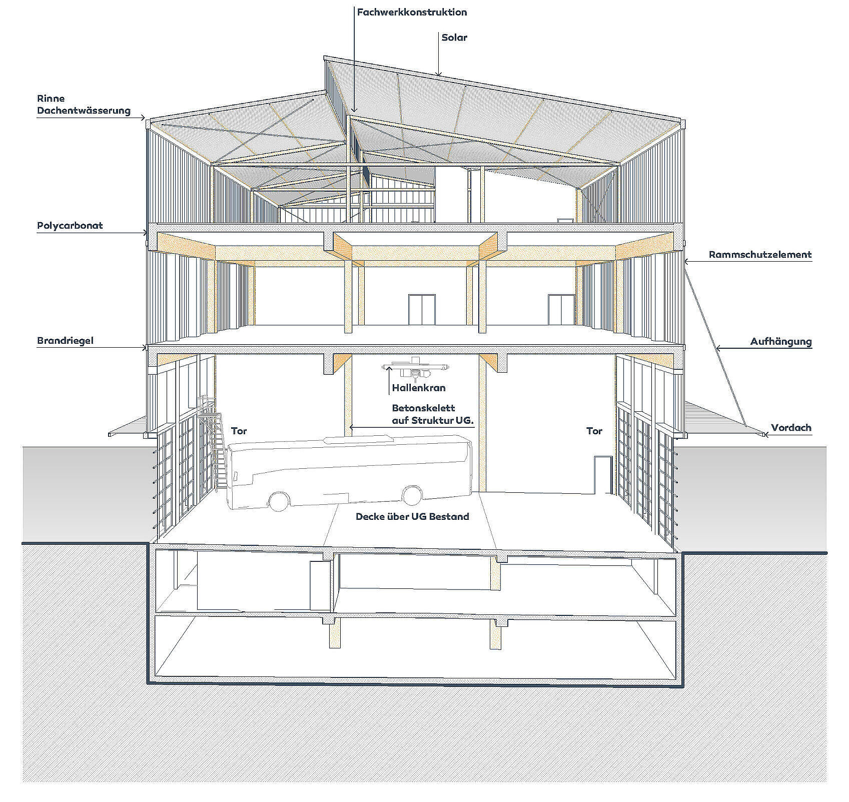 Die Konstruktion des Neubaus ist konsequent auf die betrieblichen Anforderungen und die hohen Traglasten der Lagerflächen abgestimmt und folgt einem hybriden System. Die beiden Untergeschosse bleiben in ihrer bestehenden Betonstruktur erhalten und werden punktuell mit neuen Betonelementen verstärkt, um den heutigen statischen Anforderungen zu entsprechen.