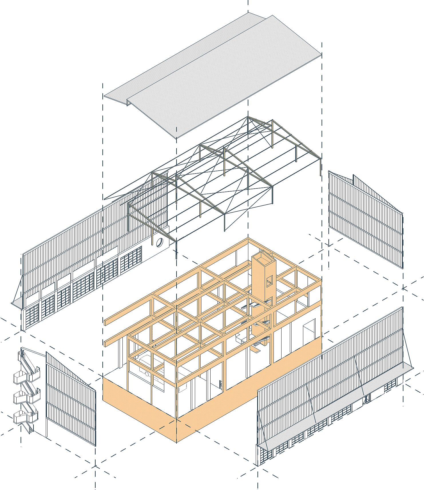 Die Gebäudehülle ist additiv konzipiert und umschliesst den gesamten Baukörper. Im Sinne einer konsequenten Bauteiltrennung kann die Fassadenschicht in späteren Lebenszyklen verändert oder ersetzt werden, ohne die Primärstruktur wesentlich zu beeinflussen.