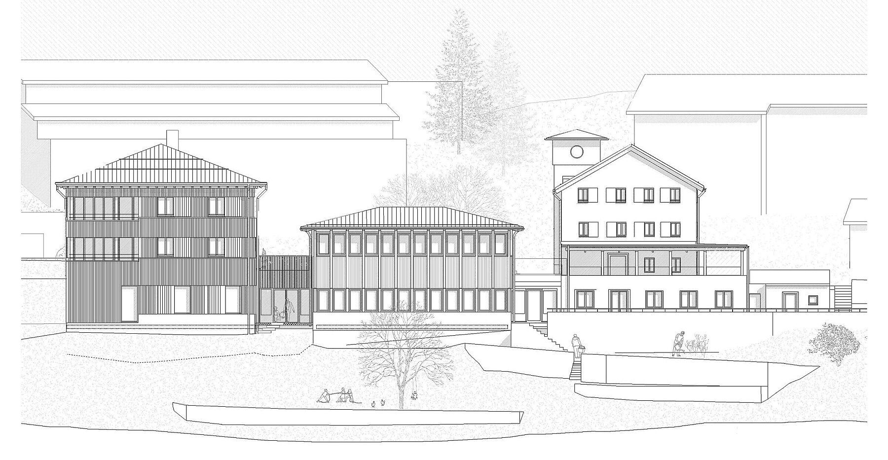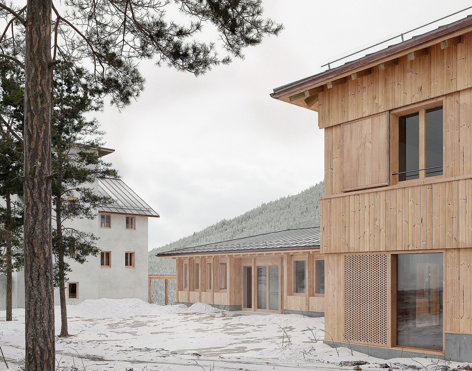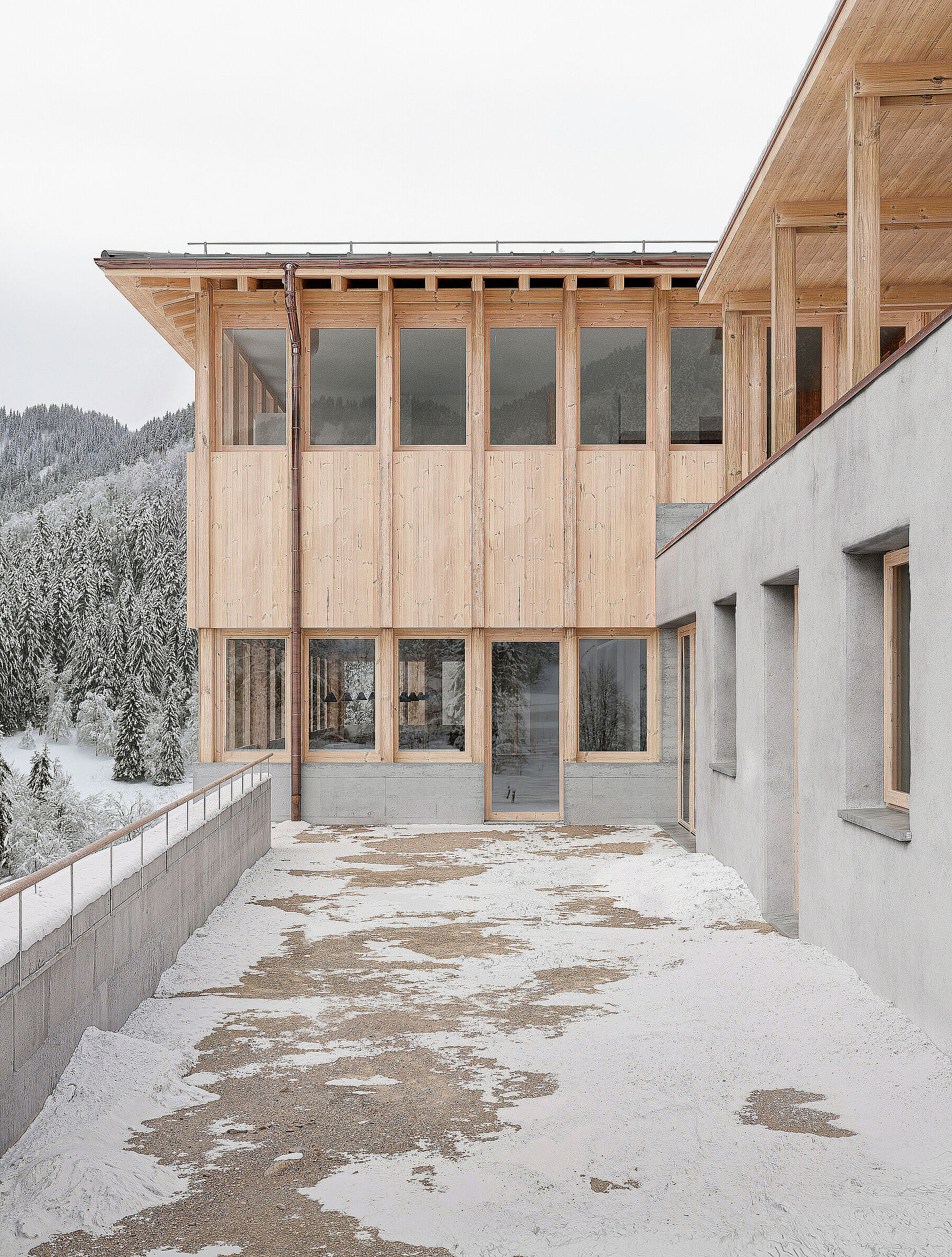 Die typologischen Merkmale des Gebäudes im Engadin wurden aufgegriffen. Die verschiedenen Nutzungen bilden sich volumetrisch und strukturell nach den jeweiligen Anforderungen ab. Im Innenraum wird das Thema der Privatsphäre atmosphärisch aufgeladen; intime Räume erhalten kleine, beschützende Öffnungen. Dem Gegenüber stehen die öffentlichen Räume; diese öffnen sich zum Panorama. Der Neubau wird mit dem historisch gebauten durch einen gemeinsamen Sockel verbunden und schafft hofseitig eine gefasste Adresse. Gleichzeitig bilden die Gebäude Richtung Waldlichtung das neue Gesicht der Schule; dies wird durch gemeinsame Themen wie die Vertikale des Saals und der Laube verstärkt.