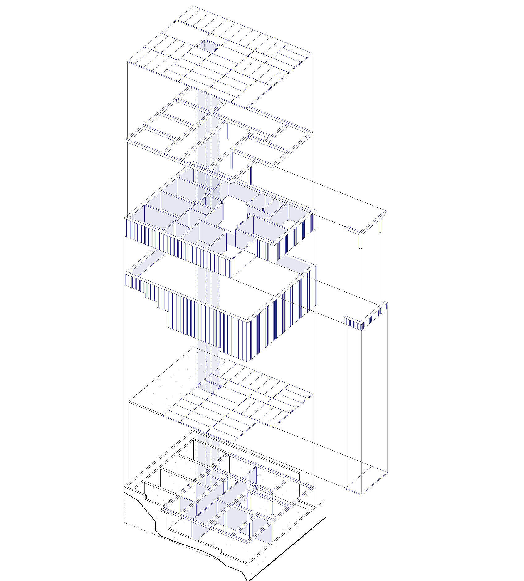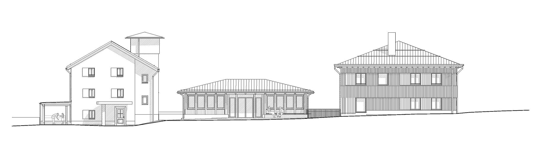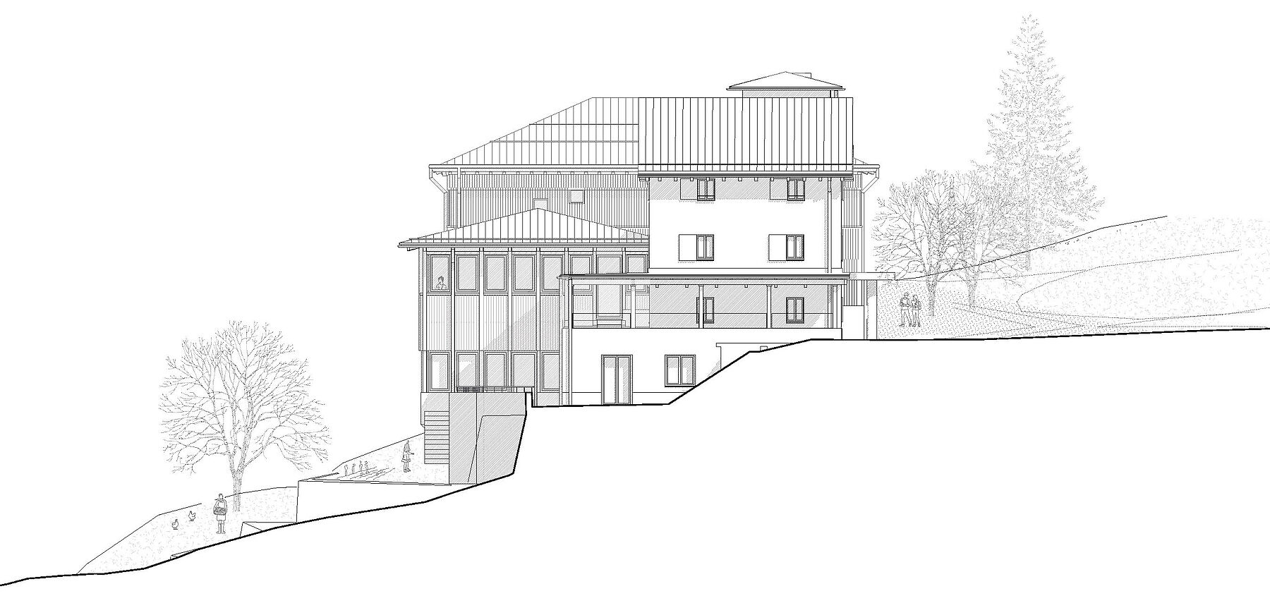 Die typologischen Merkmale des Gebäudes im Engadin wurden aufgegriffen. Die verschiedenen Nutzungen bilden sich volumetrisch und strukturell nach den jeweiligen Anforderungen ab. Im Innenraum wird das Thema der Privatsphäre atmosphärisch aufgeladen; intime Räume erhalten kleine, beschützende Öffnungen. Dem Gegenüber stehen die öffentlichen Räume; diese öffnen sich zum Panorama. Der Neubau wird mit dem historisch gebauten durch einen gemeinsamen Sockel verbunden und schafft hofseitig eine gefasste Adresse. Gleichzeitig bilden die Gebäude Richtung Waldlichtung das neue Gesicht der Schule; dies wird durch gemeinsame Themen wie die Vertikale des Saals und der Laube verstärkt.