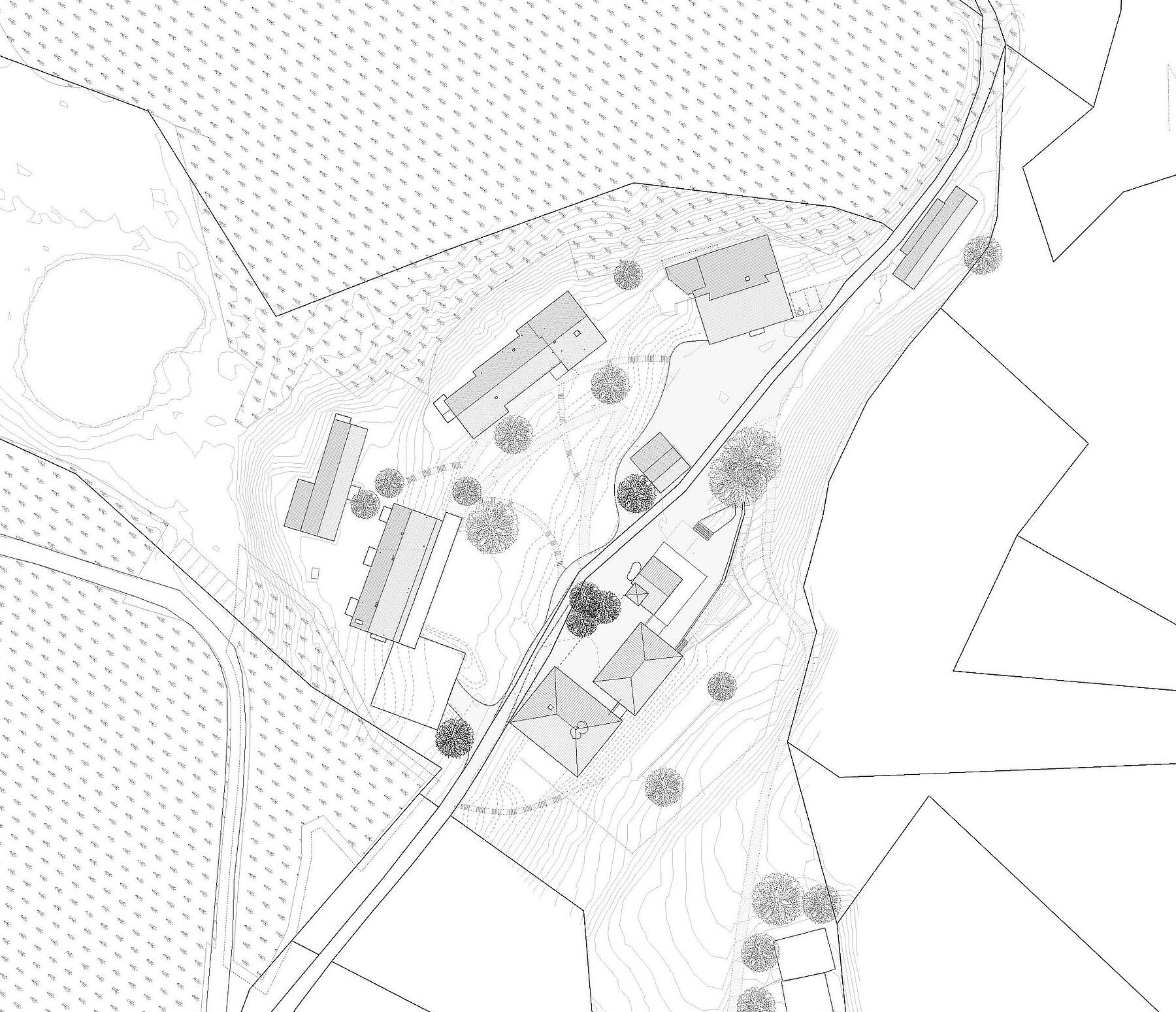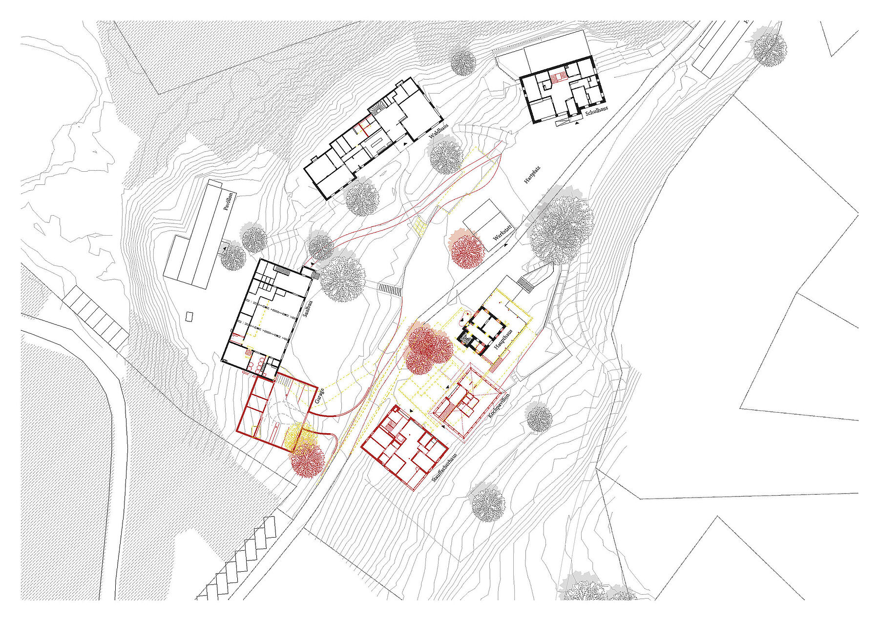 Inmitten Nadelwälder, hoch über der Clemgia-Schlucht am Eingang zum Val S-charl befindet sich die Waldlichtung Avrona. Angeschmiegt an den Wald, leicht erhöht über der Lichtung, liegt das Gebäudeensemble. Der Blick fällt Richtung Süden über die Wälder und die Bergriesen des Engadins. Dieser atmosphärische Ort erhält ein neues Holzhaus, welches als Unterkunft und Adresse der Bergschule dient. Der neue Baustein bildet den Auftakt zur Neugestaltung diverser Gebäude, welche das Gesicht zur Waldlichtung bilden.