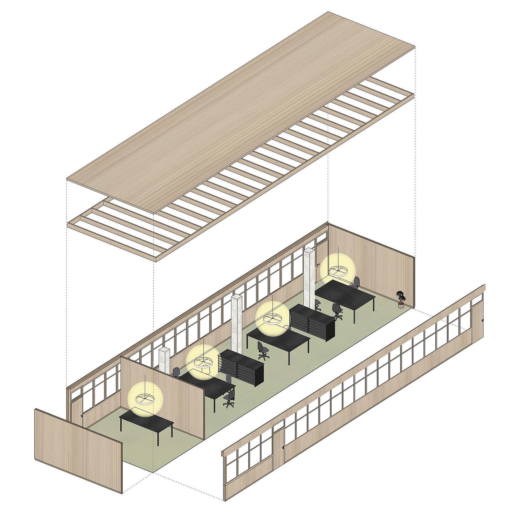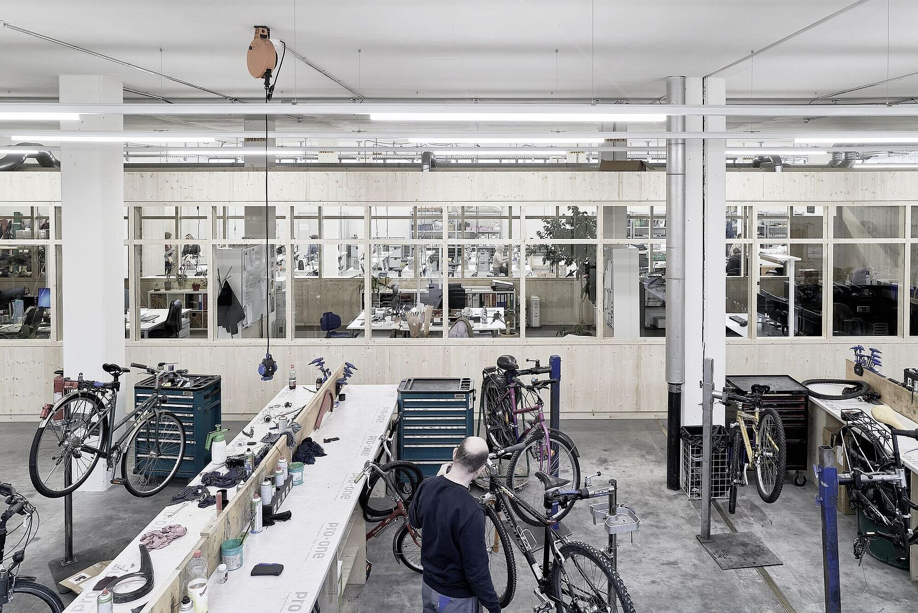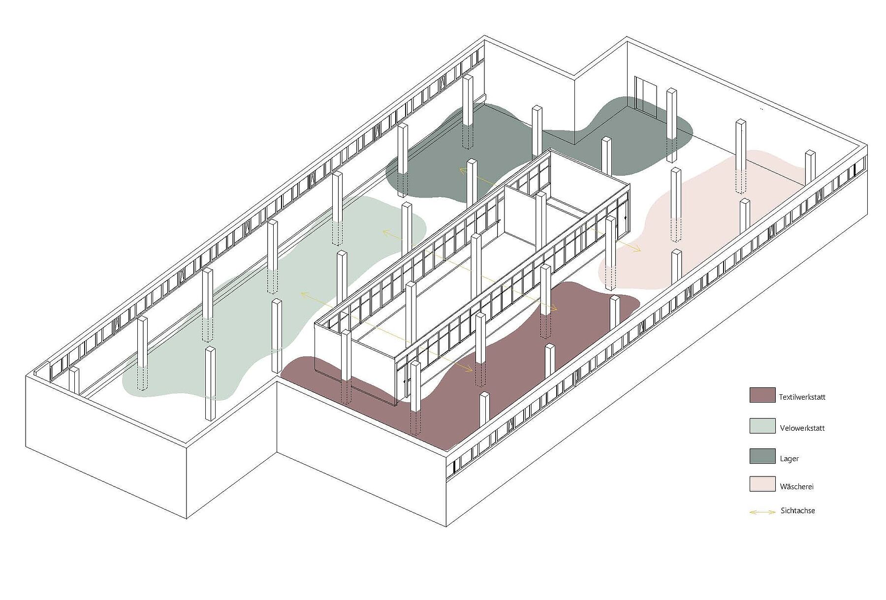 Das Lernwerk unterstützt die Integration von Erwachsenen in den Arbeitsmarkt und hilft Jugendlichen, Lehrstellen zu finden und den beruflichen Einstieg zu meistern. Langzeiterwerbslose finden dauerhafte Beschäftigung in unternehmerisch geführten sozialen Betrieben. Auf dieser Grundlage wurde ein architektonisches Konzept für die Hallen des Süssbachareals entwickelt, das sich über zwei Ebenen erstreckt. Im 1. Obergeschoss bildet einen hölzernen Kubus das Herz der neuen Produktionsstätten und sorgt für Orte der Ruhe wie auch räumliche Trennungen. Die Kantine, die sich an der Ecke zur Klosterzelgstrasse befindet, bildet ein visuelles Bindeglied zwischen den Produktionsstätten und dem sanierten Verwaltungsgebäude. Die Holzwerkstatt befindet sich im Erdgeschoss und ermöglicht einen direkten Bezug zum Inneren des Areals. Durch die grosszügigen Fensterfronten wird ein angenehmes Arbeitsklima in einem industriellen Umfeld erschaffen. Von hier sind auch die Garderoben im Untergeschoss gut erreichbar. Dazu wurden die vertikalen Erschliessungen aufgewertet und auf den heutigen Stand der Technik angepasst.