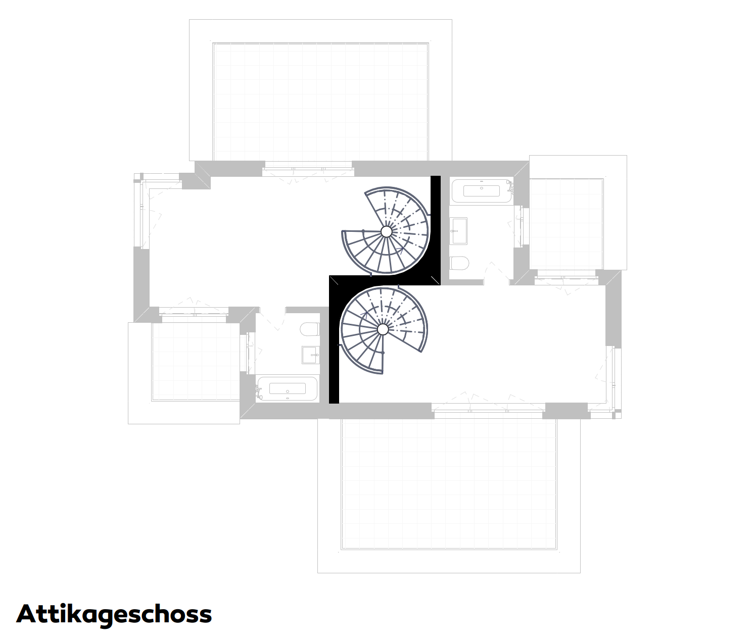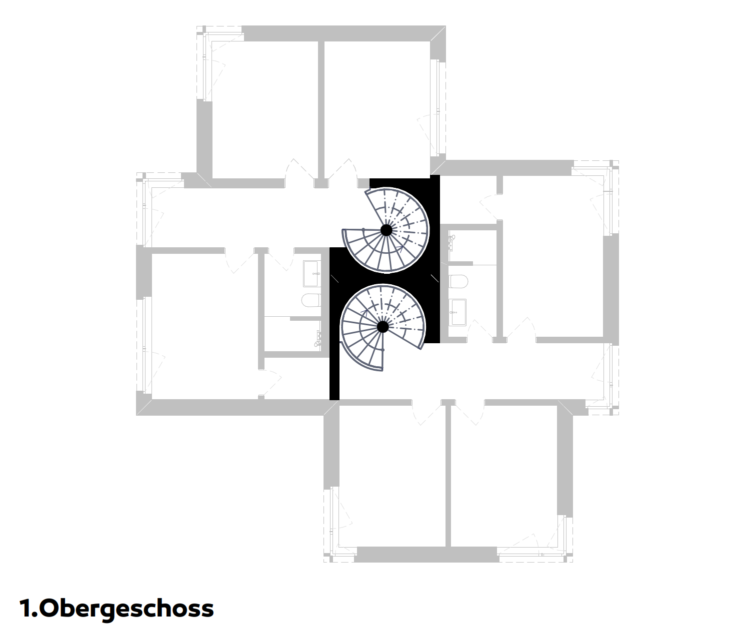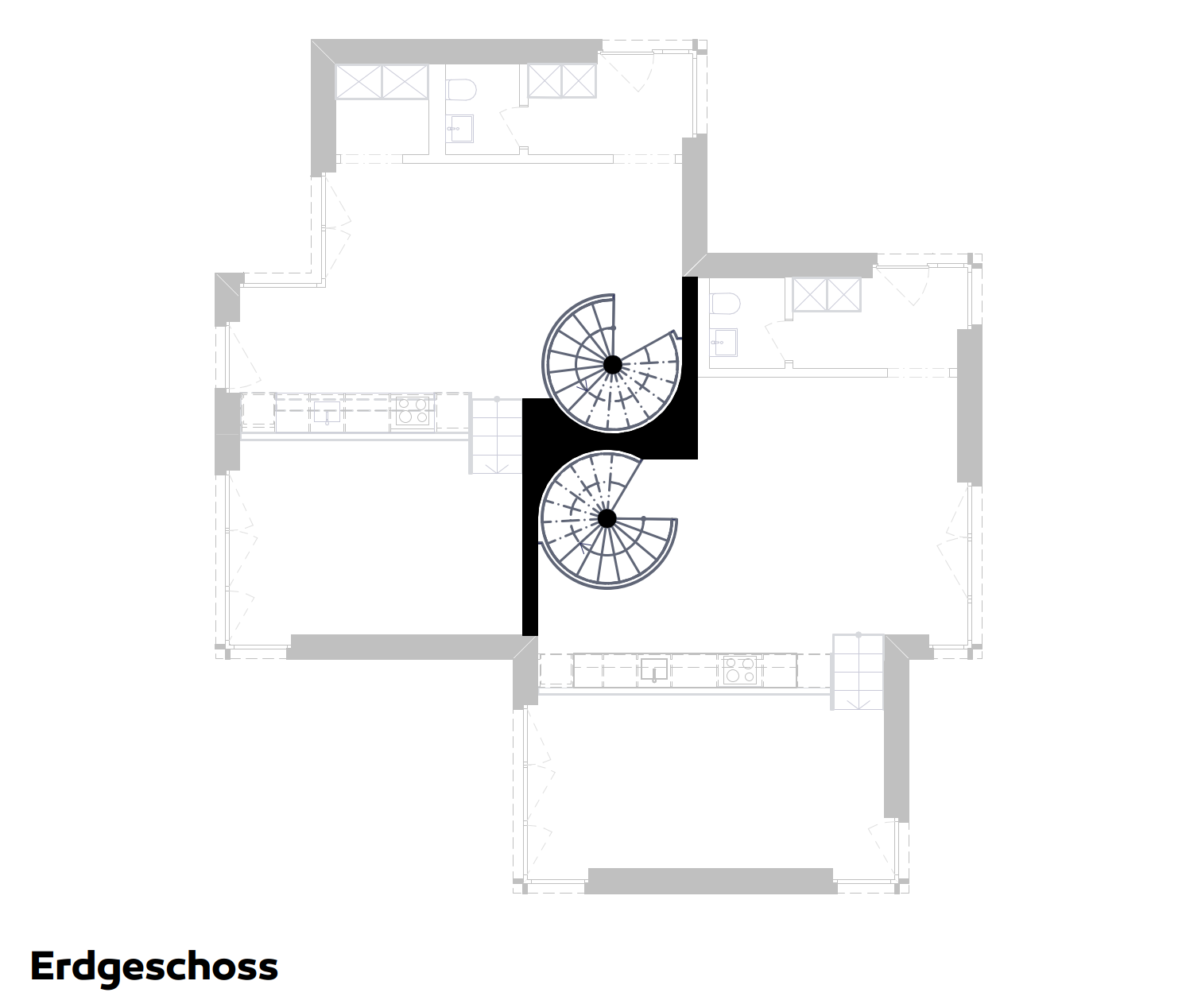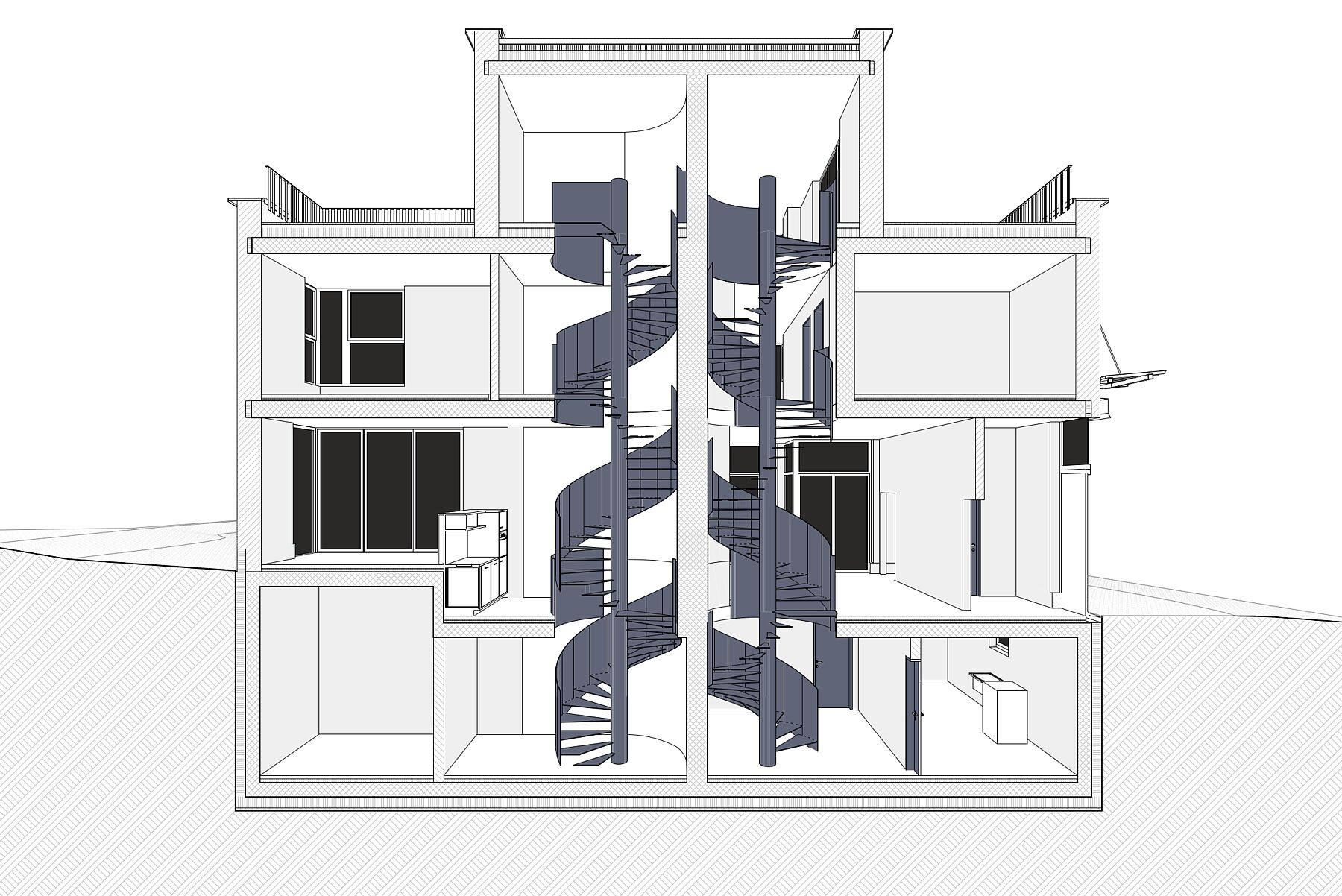 Das Zweifamilienhaus vereint zwei verwandte Wohneinheiten, die jeweils spezifisch auf ihre Aussenräume reagieren. Im Zentrum liegen zwei sich aneinander schmiegende, stählerne Spindeltreppen – ein gemeinsames Herz. Sie verbinden alle Geschosse vom Keller bis unter das Dach und machen das vertikale Bewegen zu einem räumlichen Weg durch das Haus. Mit jedem Geschoss verändern sich Atmosphäre, Licht und Blick.