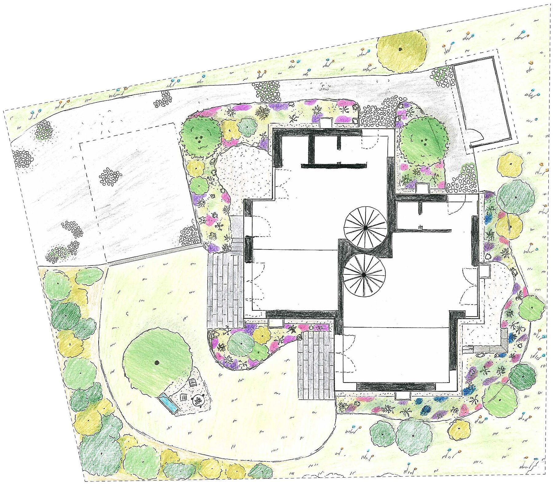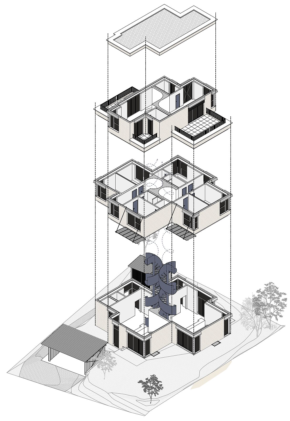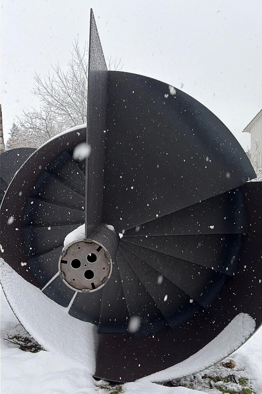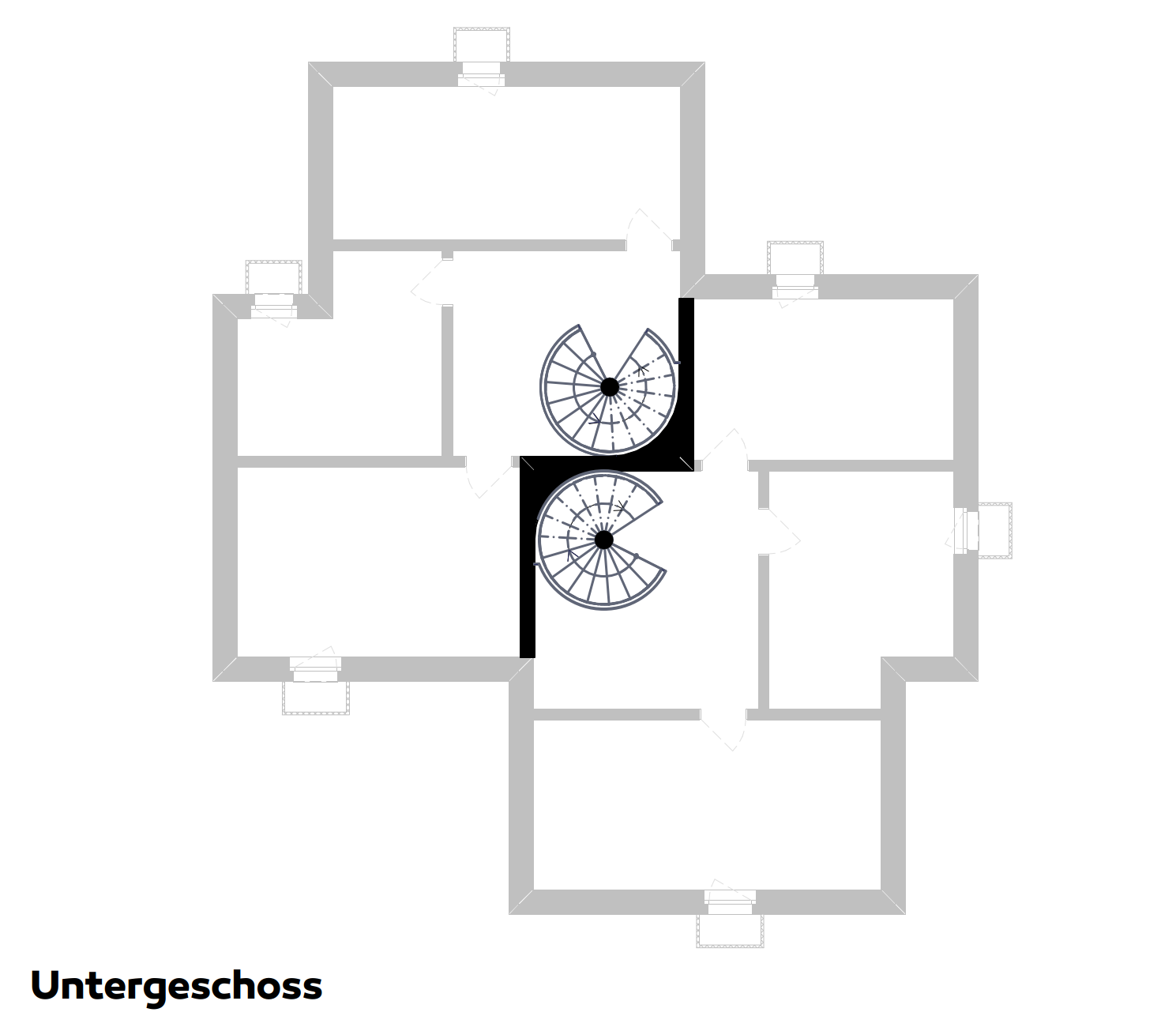 Das Zweifamilienhaus vereint zwei verwandte Wohneinheiten, die jeweils spezifisch auf ihre Aussenräume reagieren. Im Zentrum liegen zwei sich aneinander schmiegende, stählerne Spindeltreppen – ein gemeinsames Herz. Sie verbinden alle Geschosse vom Keller bis unter das Dach und machen das vertikale Bewegen zu einem räumlichen Weg durch das Haus. Mit jedem Geschoss verändern sich Atmosphäre, Licht und Blick.