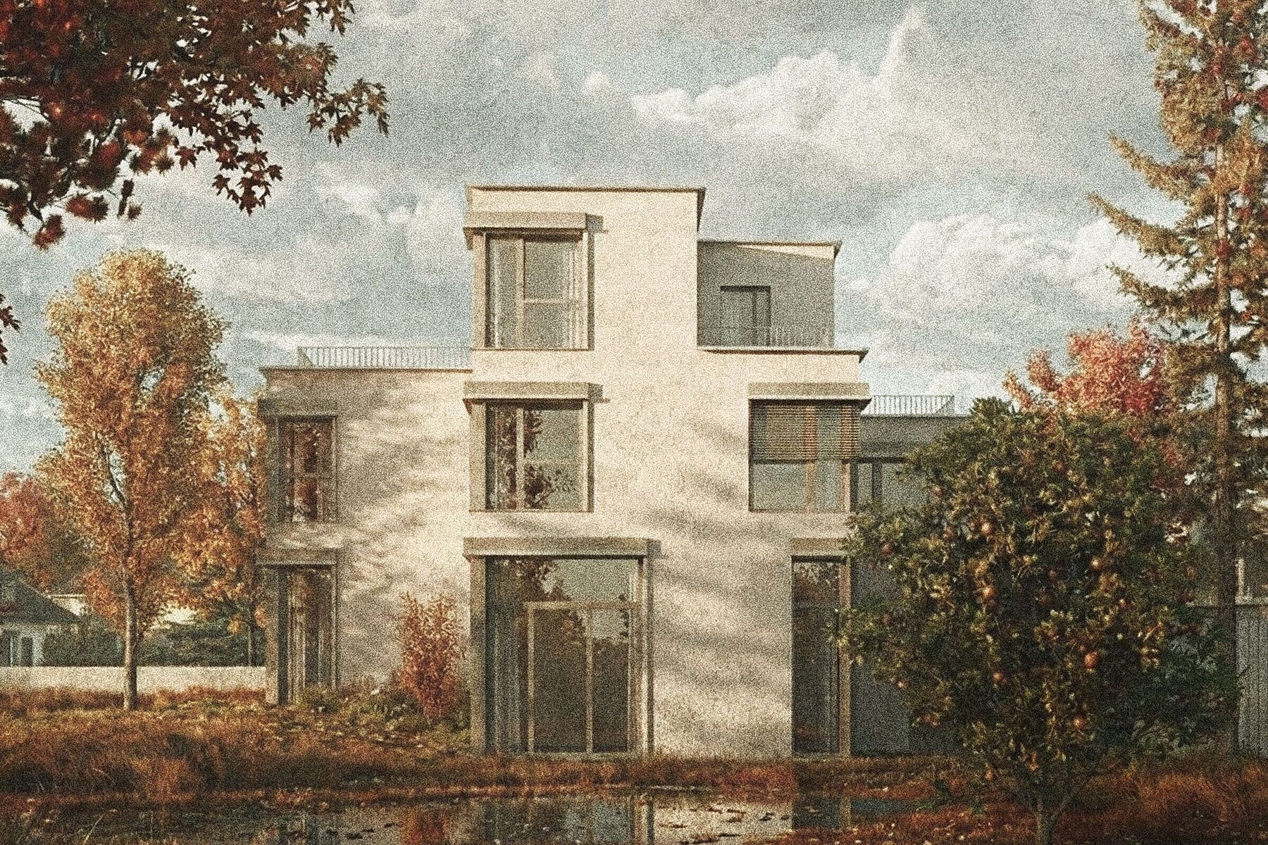 Fenster und sämtliche weiteren Metallbauteile erhalten eine fein gesetzte, pulverbeschichtete Farbnuance. Der helle Putz tritt bewusst in den Hintergrund und lässt den Akzenten Raum. Die Rahmen der öffenbaren Fensterflügel sind farblich zurückgenommen und ordnen sich der Gesamtwirkung unter.