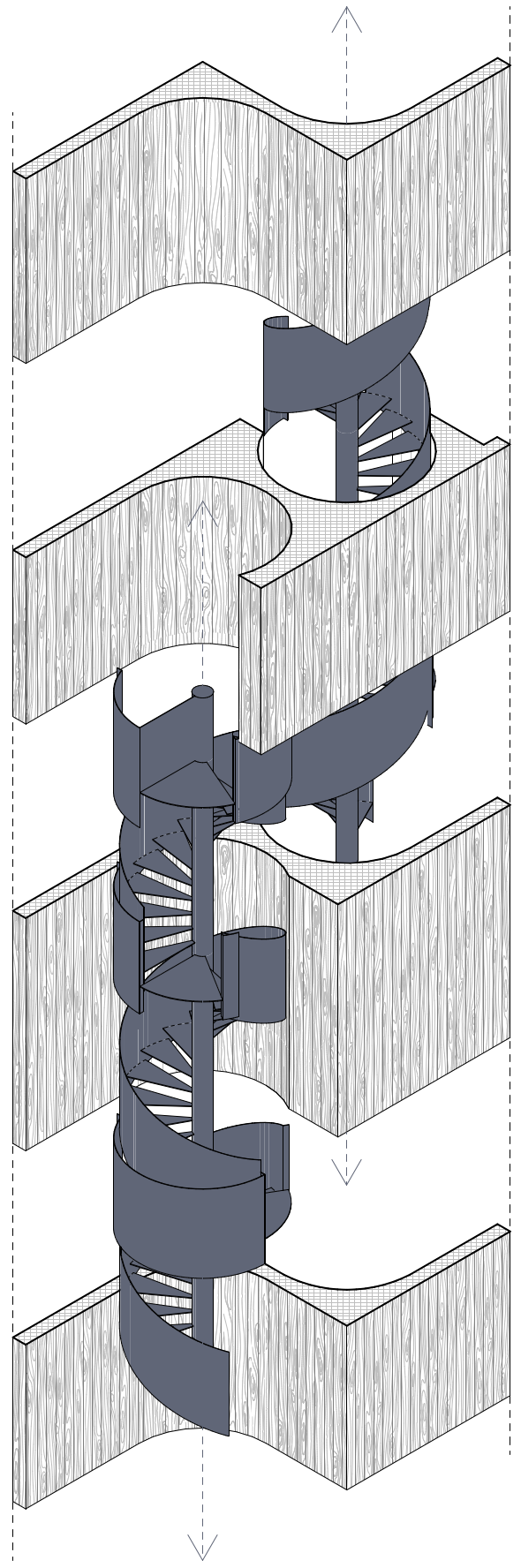 Im offenen Erdgeschoss tritt die Treppe als skulpturales Element in Erscheinung. Im darüberliegenden Schlafgeschoss wird sie von kräftigen Wänden gefasst und tritt in den Hintergrund. Der Weg endet im obersten Geschoss, einem vollständig offenen Raum, in dem die Treppe nur noch als leiser Abgang präsent bleibt.